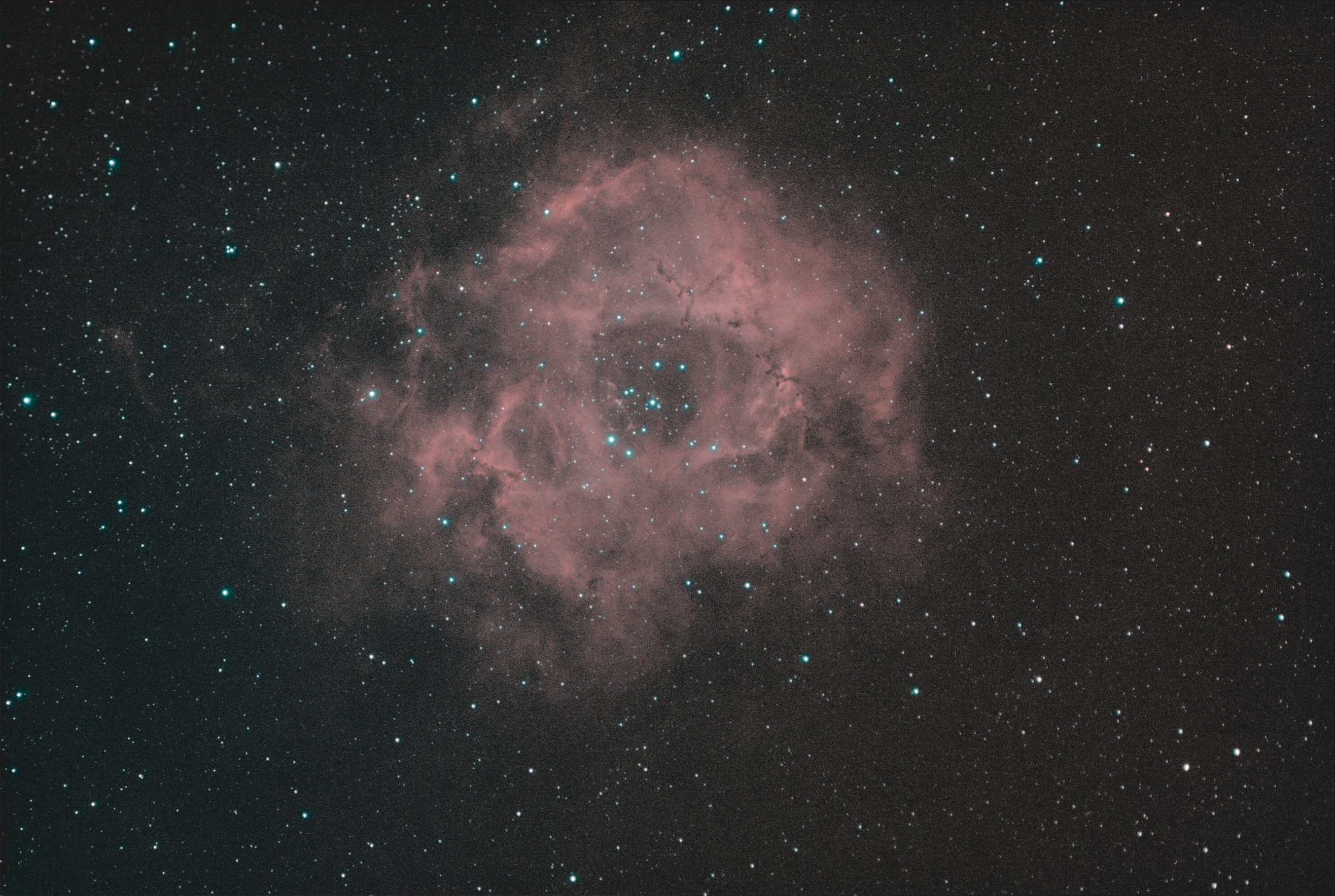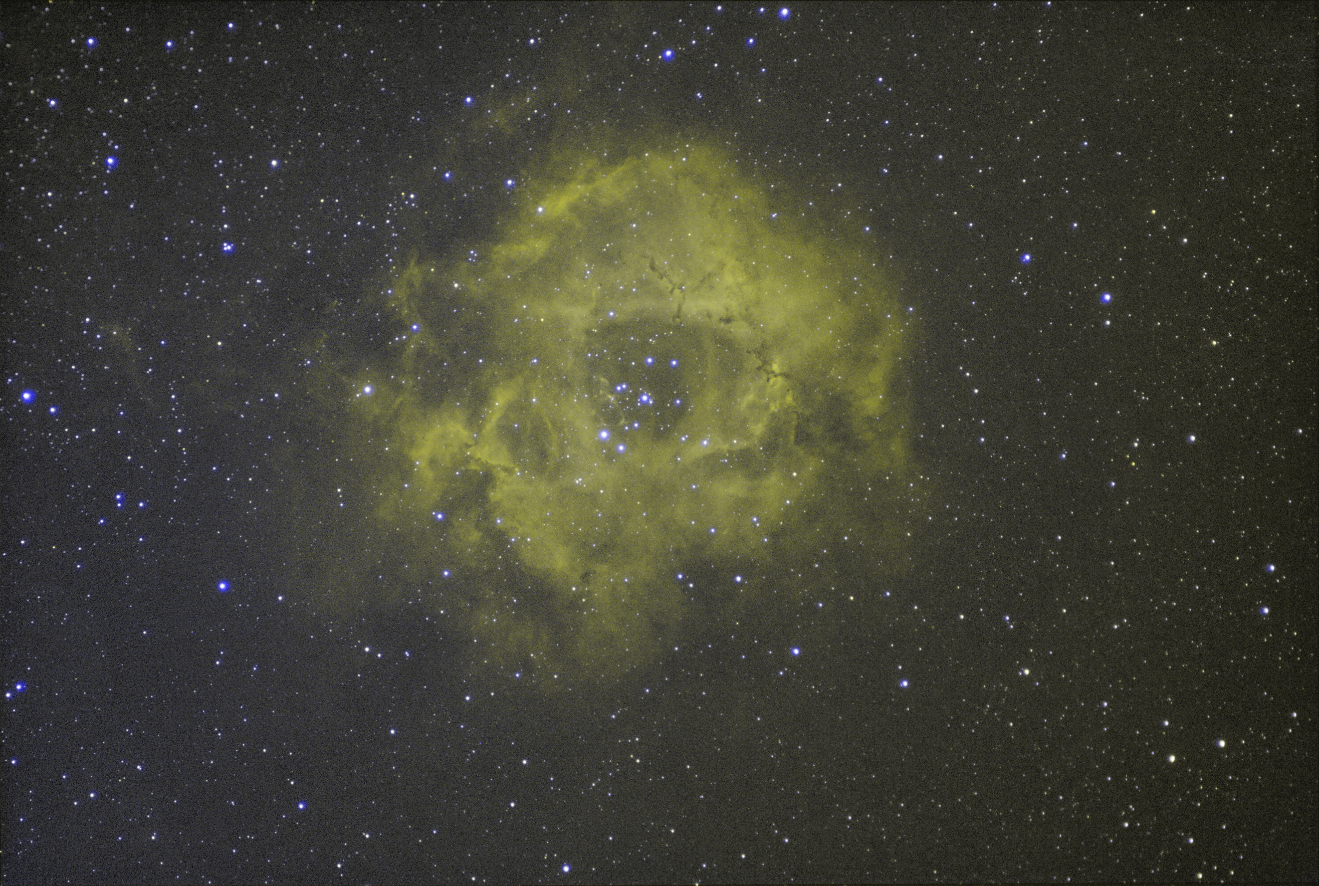 Доснял серу, по Розетке. Да. Сигнала в канале серы очень мало. Надо существенно поднимать накопление или увеличивать экспозицию одиночнак. Но вот это уже точно в следующем сезоне. SII - 15 кадров по 300 сек. (красный канал) Ha - 11 кадров по 300 сек. (зеленый канал) OIII - 13 кадров по 300 сек. (синий канал) Оборудование: Юпитер 37А, камера ZWO ASI178MM.  Просмотров: 1198