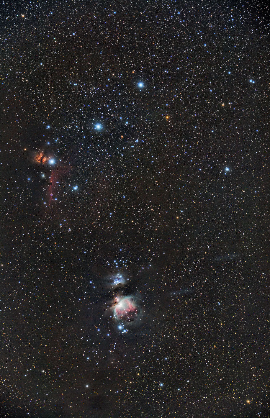 После длительного перерыва и поиска истины  , попробовал широкий угол. Орион и его окрестности. Монтировка - EQ5 модернизированная Камера - Canon 70D, стекло - Canon 70-200mm f4L Съемка - 15 кадров - 180 сек, 10 кадров - 120 сек (лайты), 10 кадров - 180 сек (дарки), 10 кадров - биасы Гидирование. Калибровка, сложение и обработка - PixInsight