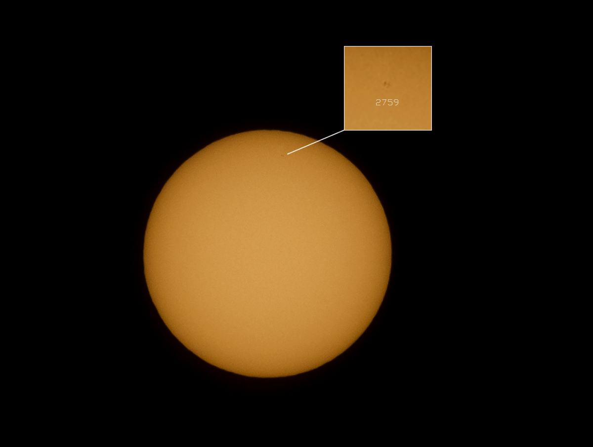 Солнце с группой пятен №2759 Сфотографировано в г.Киев 01.04.2020 г. Фотоаппарат: Nikon D5100 Обьектив: Nikkor 55-300 мм Неподвижный штатив Параметры: 300 мм | f 11| ISO 200 |1/4000 сек. солнечный фильтр из пленки Baader Planetarium, одиночный кадр. Кроп 100%