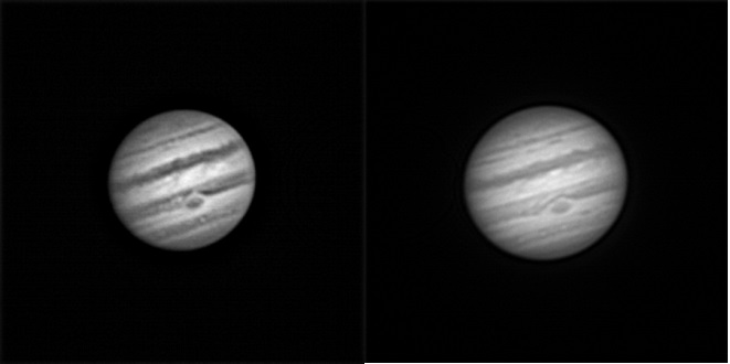 Юпитер от 11.04.2015 слева. Снимок конечно слабоват. Справа снимок Юпитера от 22.03.2015 Просто хочу обратить внимание на изменения которые произошли за истекший период в поясах планеты.