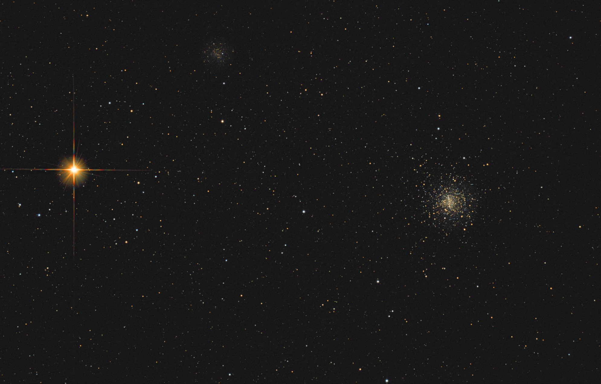 "Жемчужины" Скорпиона. Слева главная звезда созвездия - красный сверхгигант Антарес. Справа - самое близкое к Земле, крупное и яркое шаровое скопление "Кошачий Глаз", оно же М4 в каталоге Мессье. А вверху, чуть левее центра, "притаилось" меньшее шаровое скопление NGC6144. Высота объектов во время съемки около 12 градусов. Балкон многоэтажки, красная зона засветки. Три сессии в начале и середине июля 2019 года. Рефлектор Ньютона SW130/650 + комакорректор SW на EQ5 с приводом, Canon 550D, всего 279 кадров по 20 сек на iso3200. Север вверху. Масштаб 40%. Поле зрения примерно 2,1 на 1,3 градуса.  Просмотров: 992