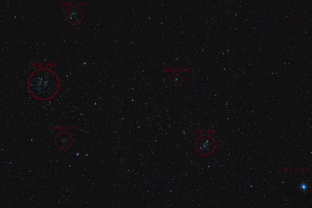 Все звездные скопления помещаются в поле зрения обычного бинокля, легко могут быть найдены и в телескоп по отличному ориентиру - звезде Дельта Кассиопеи (Рухба), звездная величина 2,65m (в правом нижнем углу). Примерно в одном градусе от Рухбы находится наиболее известное скопление, из каталога Мессье под номером 103. Левее и выше Рухбы, в радиусе примерно 2,5 градуса, находятся три скопления из каталога NGC под номерами 654, 663, 659 (сверху вниз). Кроме того на снимке присутствует очень интересный астеризм (выше и левее М103).