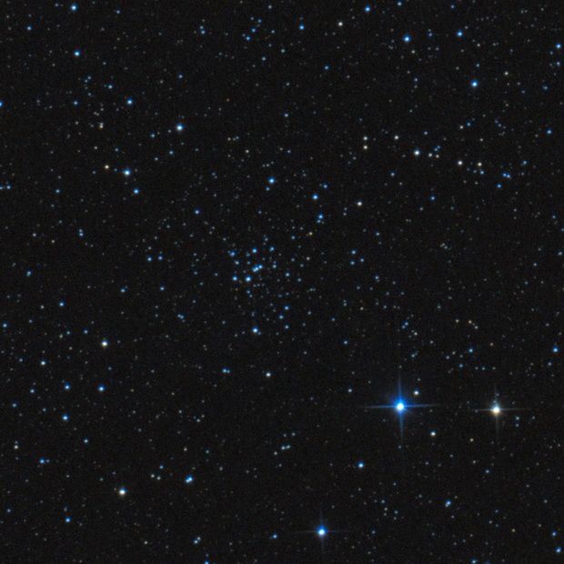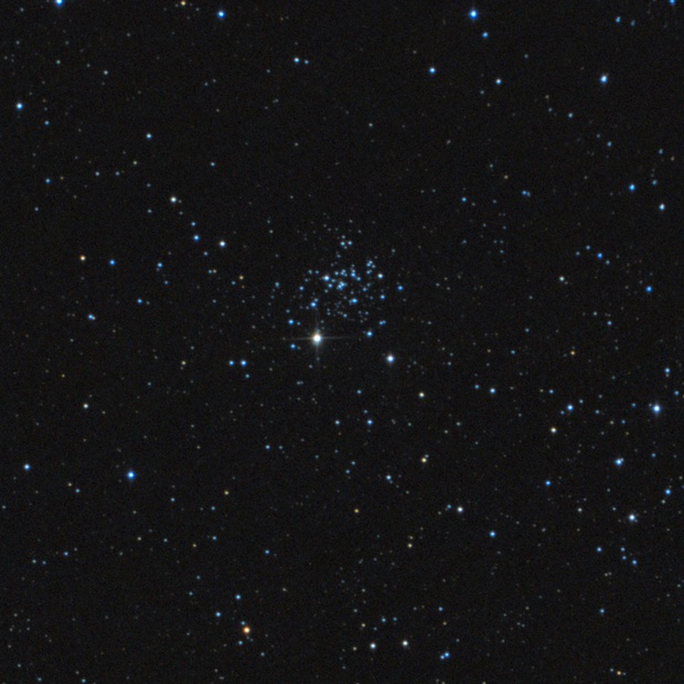 NGC 663 - диаметр скопления 16 угловых минут, интегральная звездная величина 7,1m, расстояние примерно 6,5 тыс.световых лет. Расположено на фоне нескольких звезд примерно 9 звездной величины. Сумма из 119 кадра по 10 сек. Кроп 50%, поле примерно полградуса.