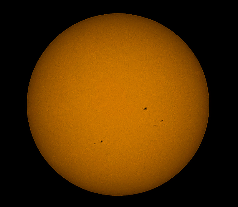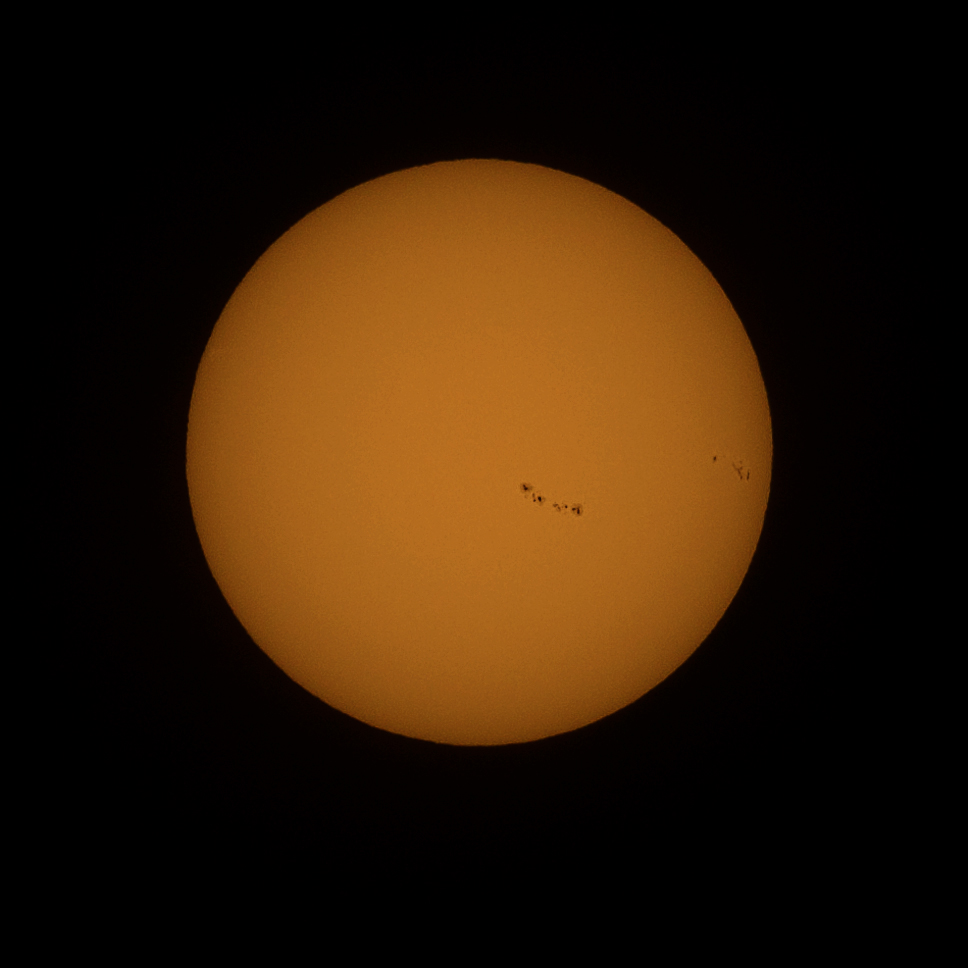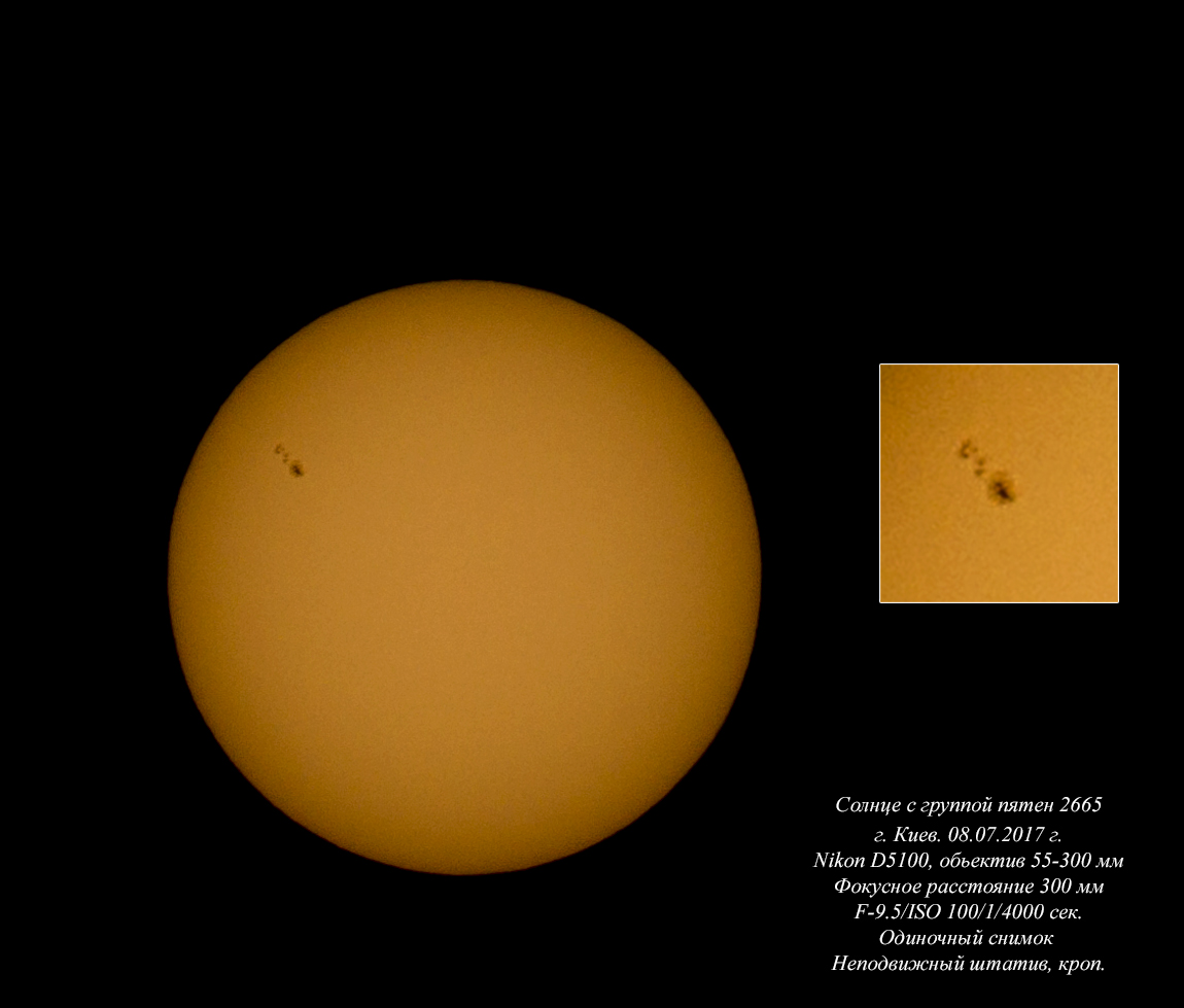 Солнце с группой пятен. г.Киев. 08.07.2017г. Никон Д5100, обьектив 55-300 мм Фокусное расстояние 300 мм, F-9.5/ISO 100/1/4000 сек., экспокоррекция -5, солнечный фильтр из пленки Baader Planetarium, одиночный кадр. Кроп 100%