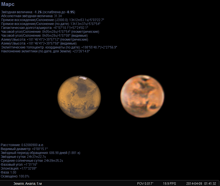 Марс, 9 апреля 2014 года, 1:41. Sky-Watcher BK Dob 12" Retractable без моторов, линза Барлоу НПЗ PAG 3-5x (5x), Canon 550D (640x480@60fps), PIPP, Autostakkert (500 кадров из 11000), Registax 6. Несколько вариантов обработки, пожестче и помягче.