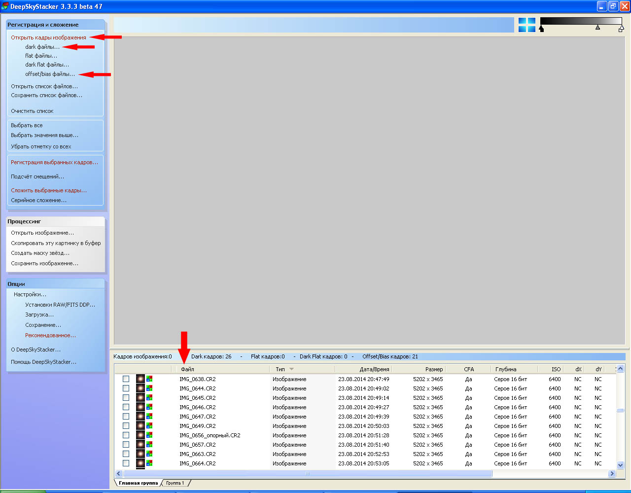 Загрузим поочередно с диска нашего компьютера кадры изображения, dark файлы и offset/bias файлы, (flat файлы я не использовал, о чем упоминал выше, если эти файлы у вас есть, то нужно загрузить и их). По мере загрузки файлы будут появляться в окошке списка файлов в нижней части рабочего окна.  Просмотров: 8325