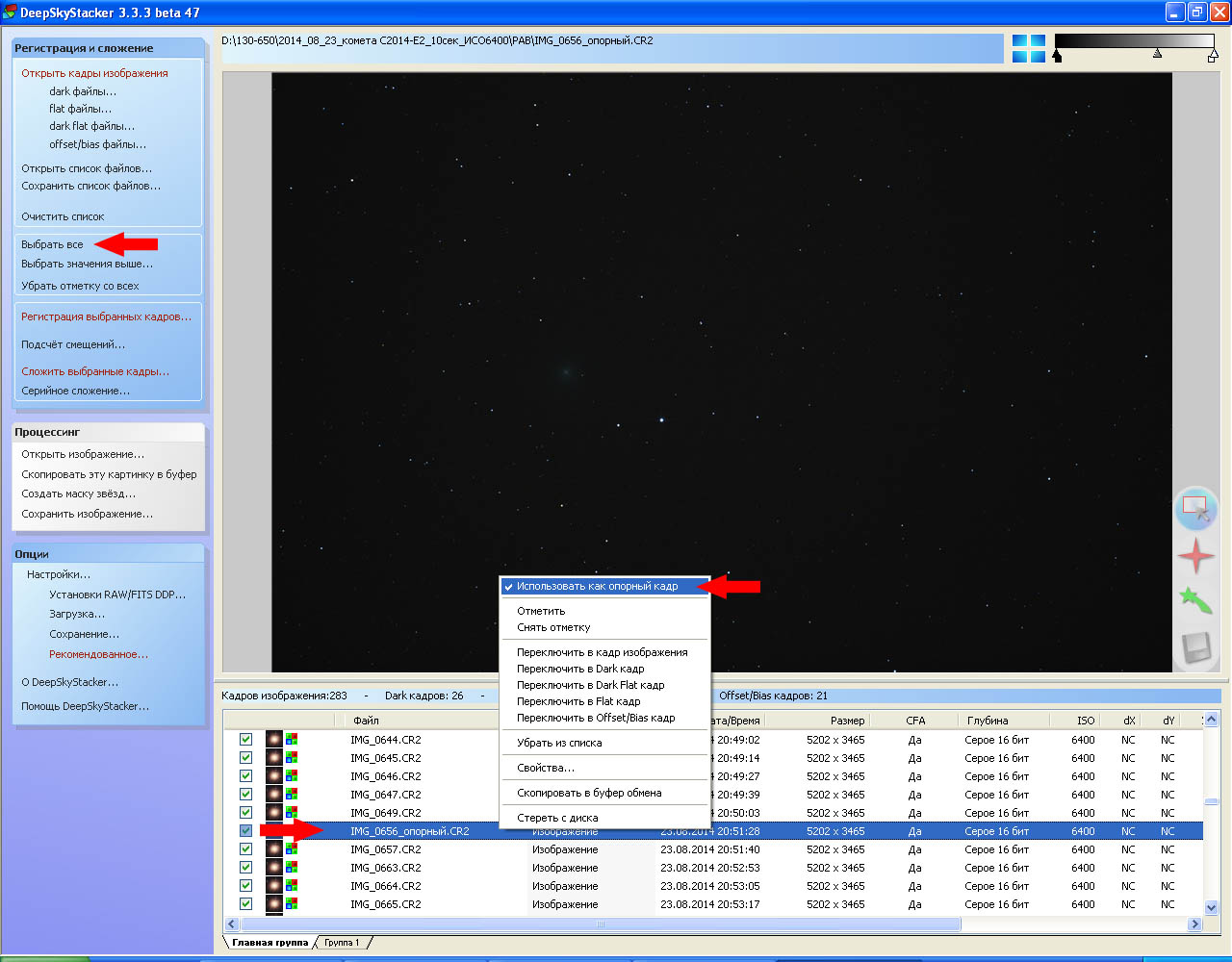 Далее отметим все файлы нажав пункт меню Выбрать все. Теперь важный момент - необходимо выбрать опорный кадр изображения, щелкнем на нем правой кнопкой мыши и в выпадающем списке поставим галочку Использовать как опорный кадр. Изобржение этого кадра появится в окошке пред-просмотра верхней части рабочего окна. По каким критериям выбирать опорный кадр? Это должен быть кадр не испорченный ошибками ведения, без треков спутников и метеоров, не сильно размытый турбуленцией атмосферы, без случайной засветки...  Просмотров: 8325