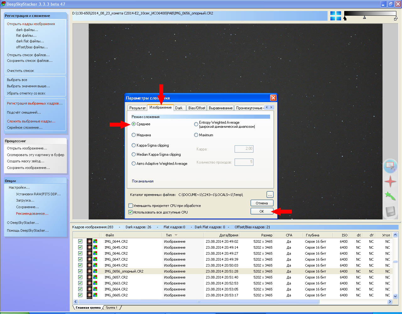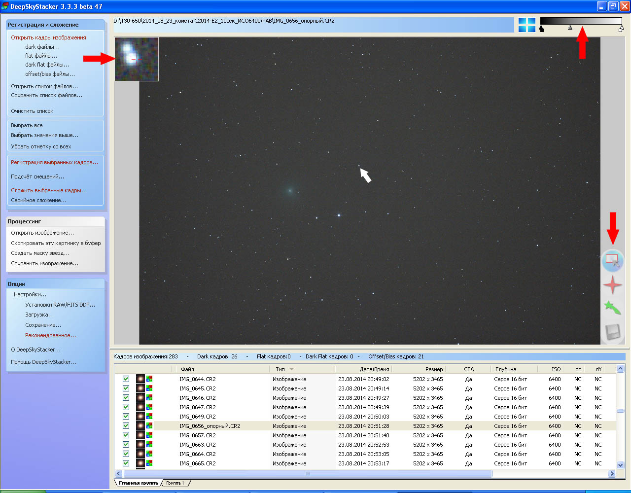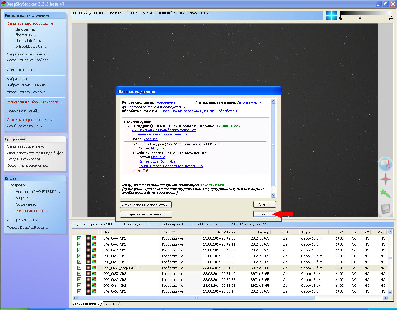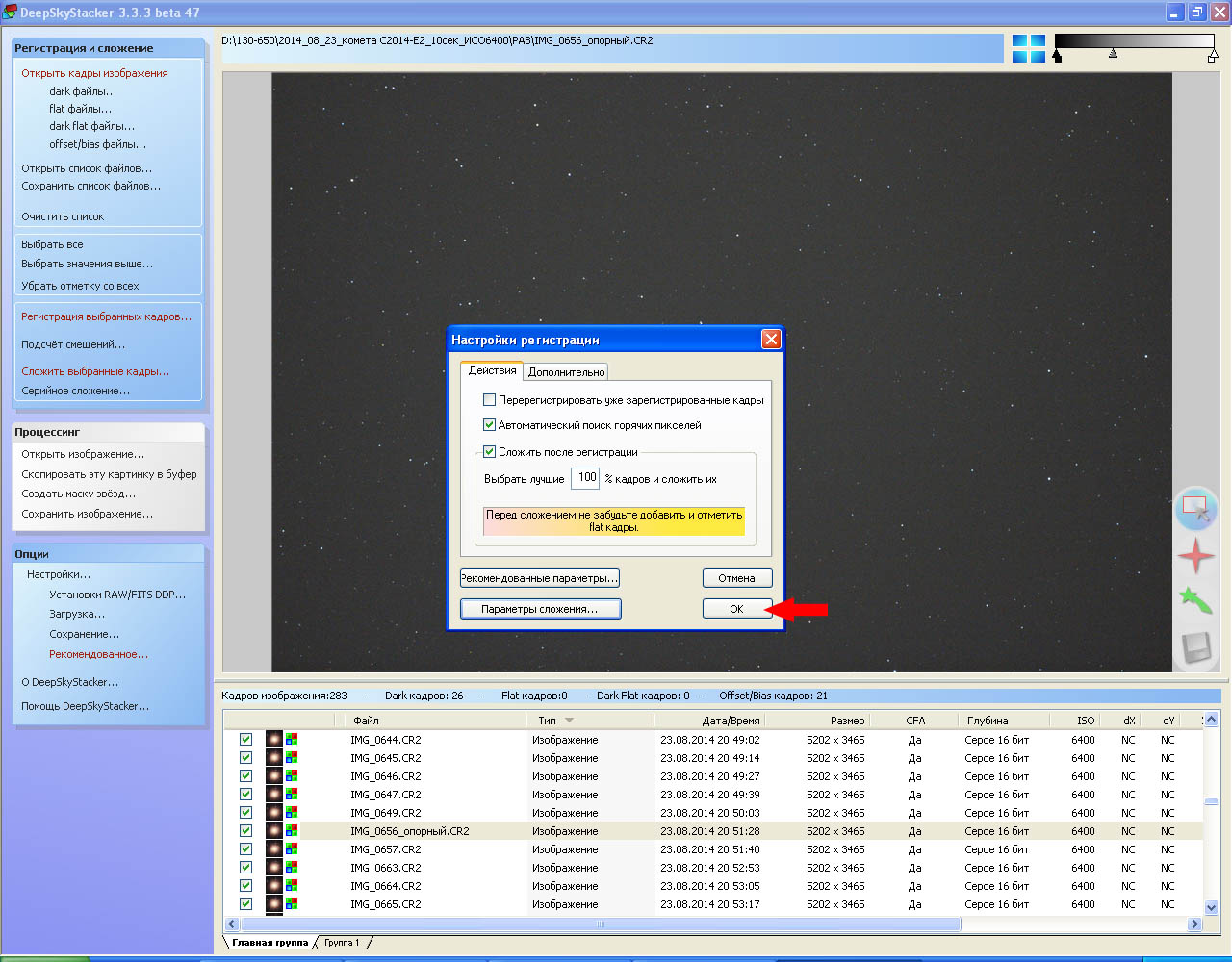 Итак, мы рассмотрели назначение всех настроек программы DeepSkyStacker, понимаем необходимость в калибровочных кадрах и способы их получения. Далее приступим непосредственно к самой обработке серии фото с кометой C/2014 E2 Jackues.