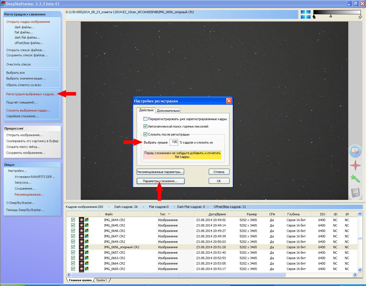 Идем дальше Жмем Регистрация выбранных файлов...В окошке Настройки регистрации выберем процент кадров которые мы хотим сложить. Я выбираю 100%, потому что я предварительно просматриваю и удаляю плохие и бракованные кадры. Жмем Параметры сложения... Просмотров: 8323