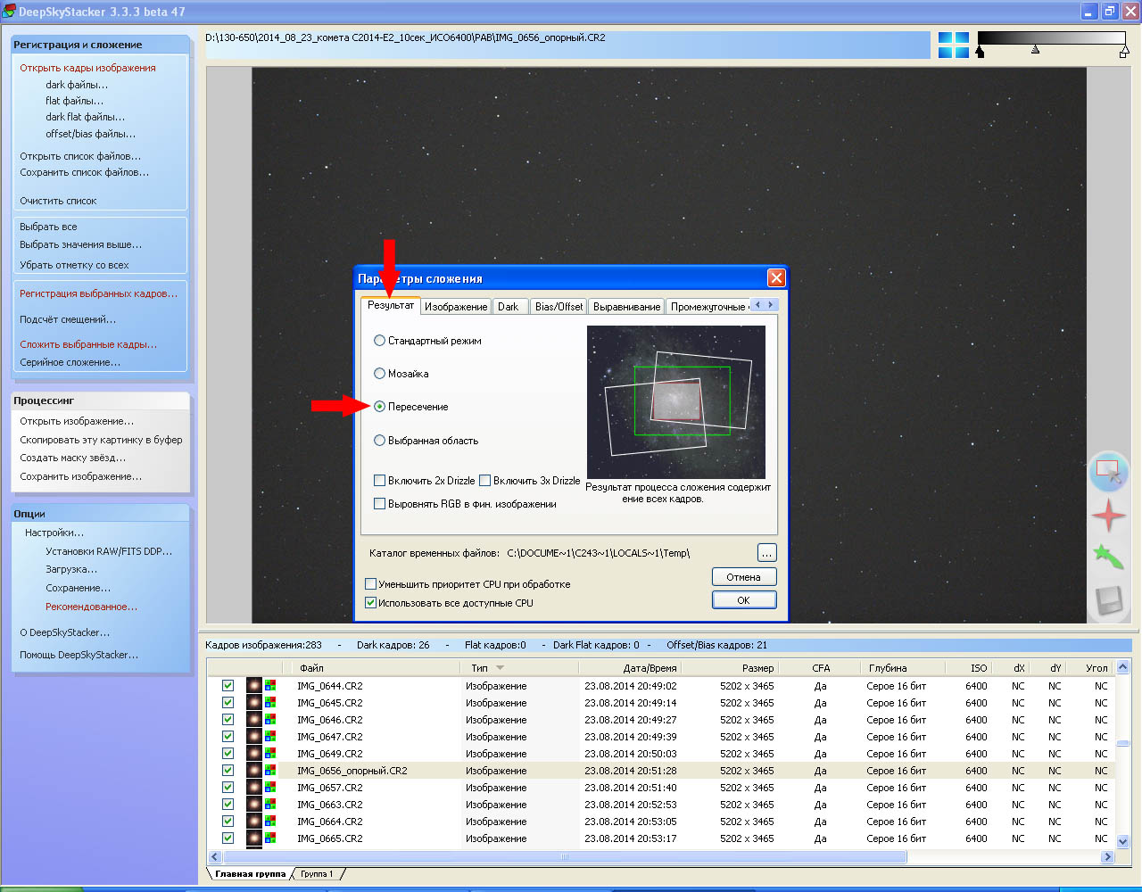 Первым делом я собираюсь получить результат с неподвижными звездами и треком кометы. Серия довольно продолжительная, со значительным смещением от первого кадра до последнего — поэтому во вкладке Результат выберу режим Пересечение.  Просмотров: 8289