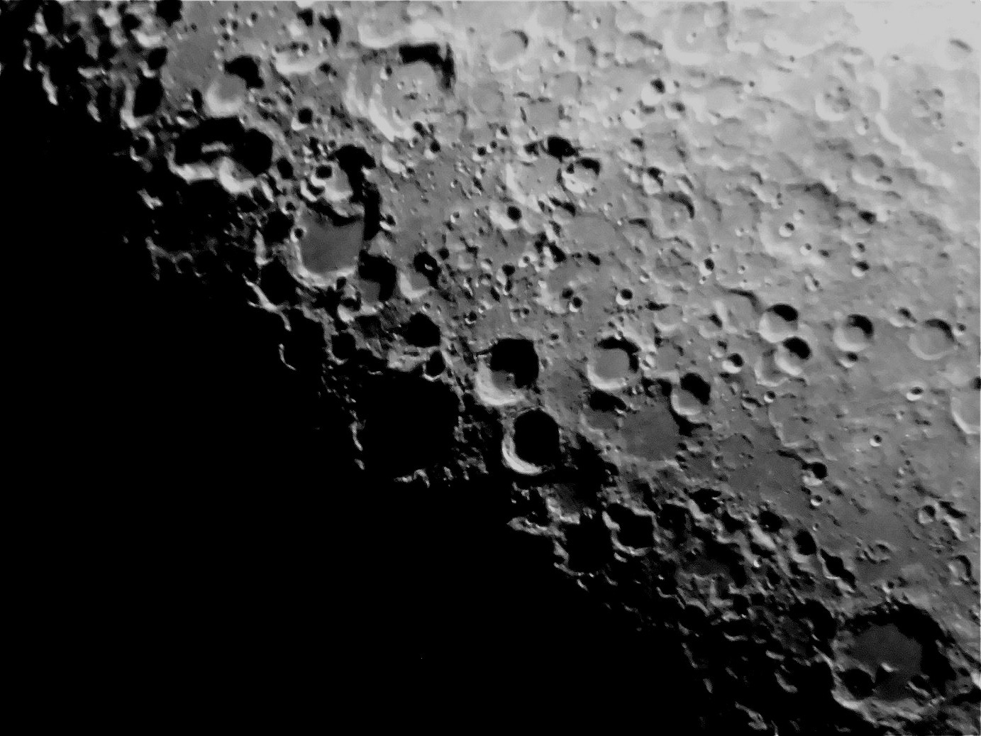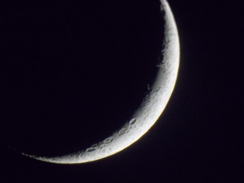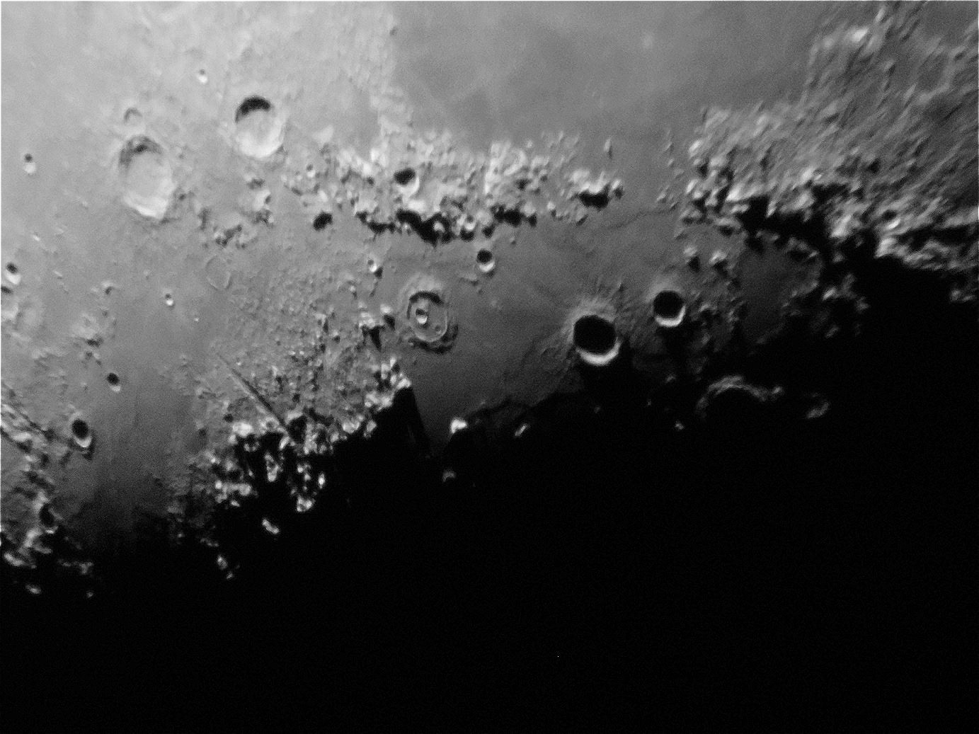 Сегодня попробовал сделать первые фото Луны. Снимал на телескоп 150_ 750 мм окуляр 17мм цифромыльницей. Фотоаппарат держал в руках перед окуляром. Одиночный кадр.