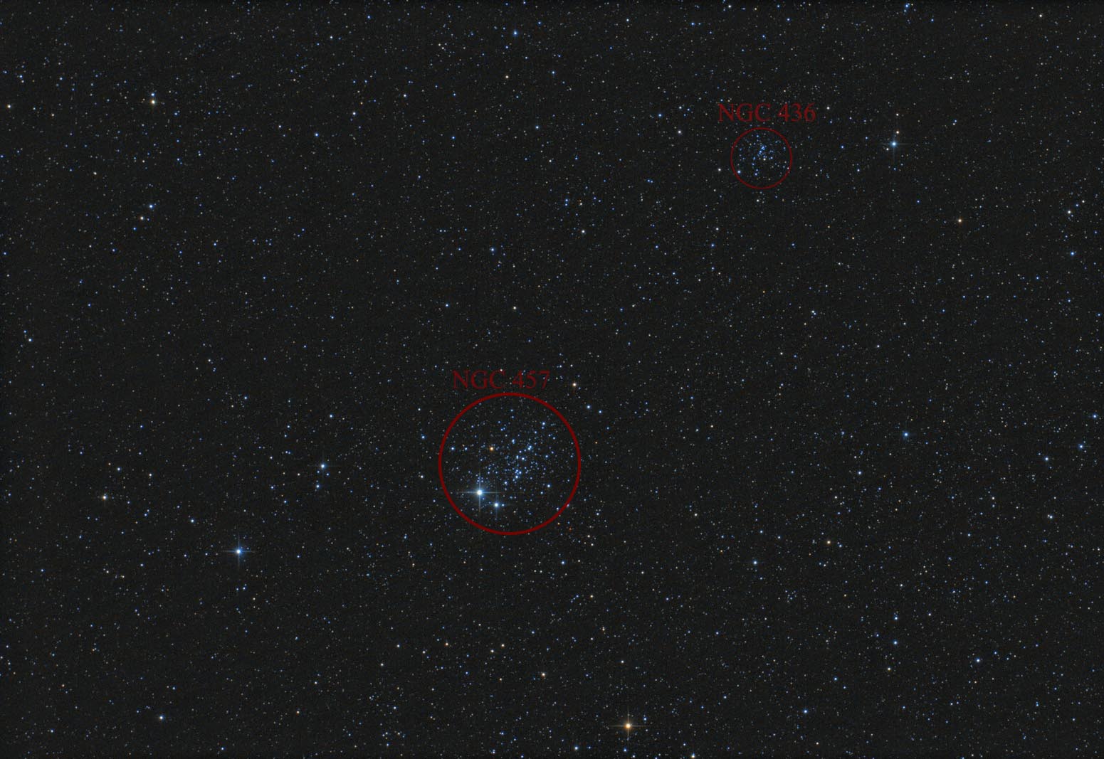Большее скопление NGC457 имеет диаметр 13 угловых секунд и блеск 6,4 звездной величины, меньшее NGC436 - диаметр 6 уговых секунд, блеск 8,8 звездной величины.  Просмотров: 2277