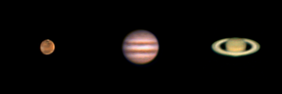 Вот сразу три планеты, снятые 14 мая 2014 года - Марс, Юпитер и Сатурн через 90мм Максутов-Кассегрен в одном и том же масштабе. Использовалась Барлоу 2х с Т-адаптером, монтировка Vixen Porta II (ручное ведение), камера Canon 550D (видеоролики по 3...5 минут), обработка в Autostakkert, R6.