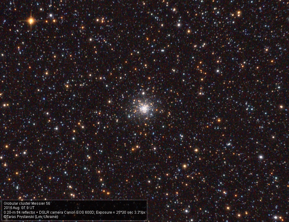 Кулясте зоряне скупчення Мессьє 56 в сузір'ї Ліри. Обладнання: телескоп Sky-Watcher BKP200/F800 на NEQ-6 SYN SCAN, Coma corrector Baader Planetarium Mark III MPCC, 2", фотоапарат Canon EOS 600D; Складено 25 кадрів по 30 сек, ISO 1600, післяобробка в DeepSkyStacker, FITStackerV10, Maxim DL 5, Photoshop CS.