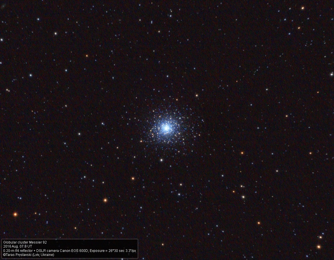 Кулясте зоряне скупчення Мессьє 92 в сузір'ї Геркулес. Обладнання те ж саме. Складено 26 кадрів по 30 сек, ISO 1600, післяобробка в DeepSkyStacker, FITStackerV10, Maxim DL 5, Photoshop CS.