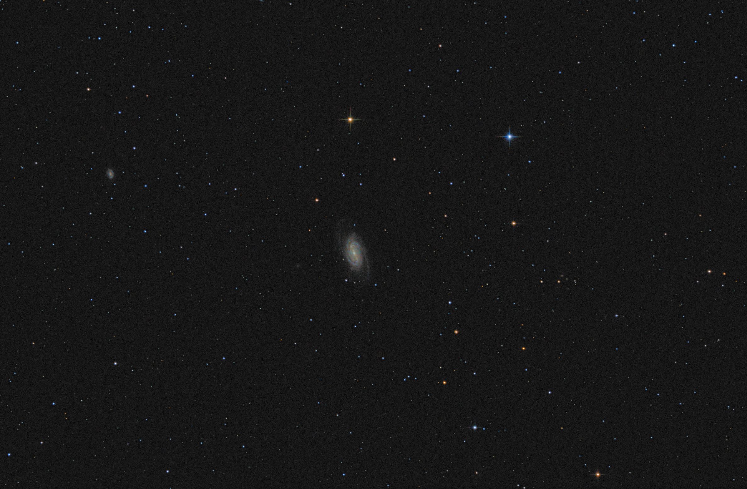 Две галактики у "головы" созвездия Лев. В центре спиральная галактика с перемычкой NGC2903 (блеск 9.6m, размер 12'х6'), слева спиральная радиогалактика NGC2916 (блеск 12.7m, размер 2.5'х1.7') Два вечера в начале мая (без Луны, но с дымкой) и два вечера во второй половине мая (без дымки, но в полнолуние).
