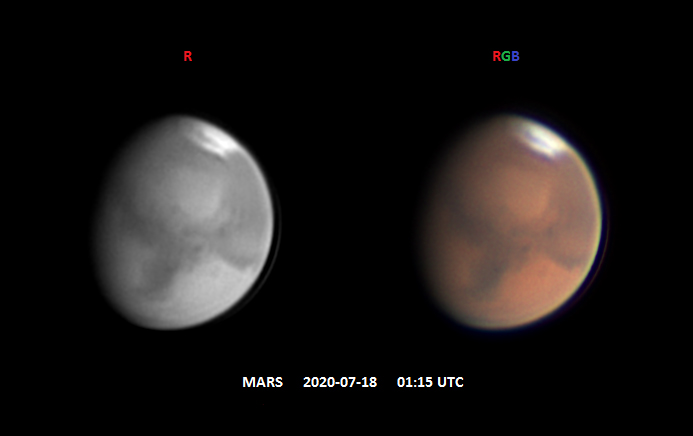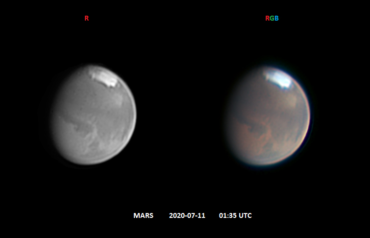 Марс от 11 июля Dall-Kirkham, 265 mm, 1:21. Конвертация файла в VirtualDub + PIPP. Сложение в RegiStax 5. Пост-обработка в Astra Image 3.0 Pro. R-канал FireCapture v2.6 Camera=QHY5LII-M Diameter=12.34" Magnitude=-0.68 Date=110720 Start=041828 Duration=120.025s Frames captured=4458 File type=SER ROI=640x480 FPS (avg.)=37 Shutter=16.93ms Gain=7 (24%) Histogramm=70% 120 Seconds
