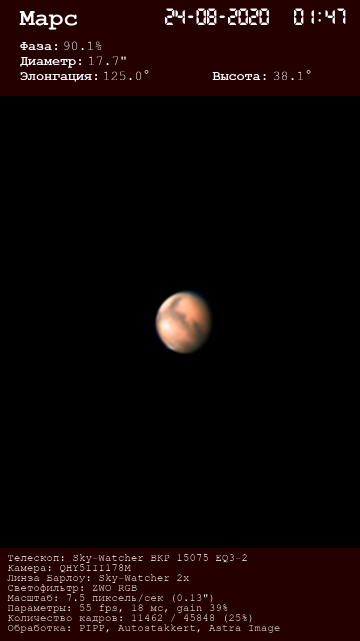 Найкращий Марс в цьому сезоні, поки, був 11 липня. Телескоп, камера і параметри ті ж самі.