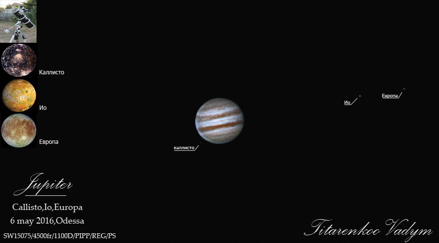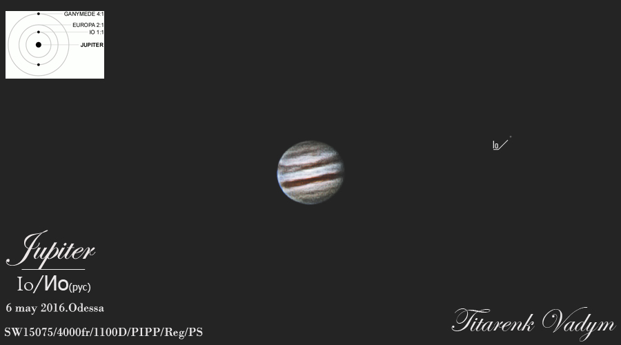 Юпитер и спутник Ганимед -) от меня и Сергея Козельского. Вчера вечером наблюдали его в 20 км от Минска. Телескоп SKY WATCHER N-200, Canon 550d, съёмка через окуляр Baader Planetarium Hyperion 3.2 + две втулки 15+24 мм. Сложение 4250 кадров в RegiStax 5.1.