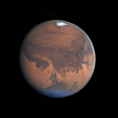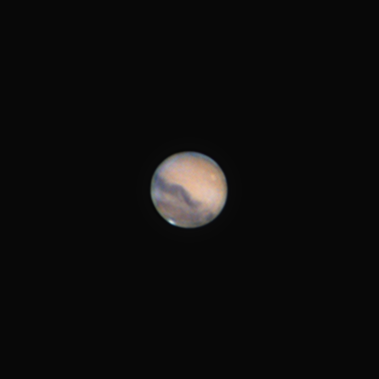 Марс от 12-го числа. Еле успел снять, туман помешал. Но пока это лучшее что получилось за последнее время по Марсу. Телескоп Sky Watcher BKP15075 EQ3-2. Камера Qhy5III178M. Ролики по 4 минут, примерно 25% кадров из 13000. Обработка Astra Image + Winjupos + Photoshop.