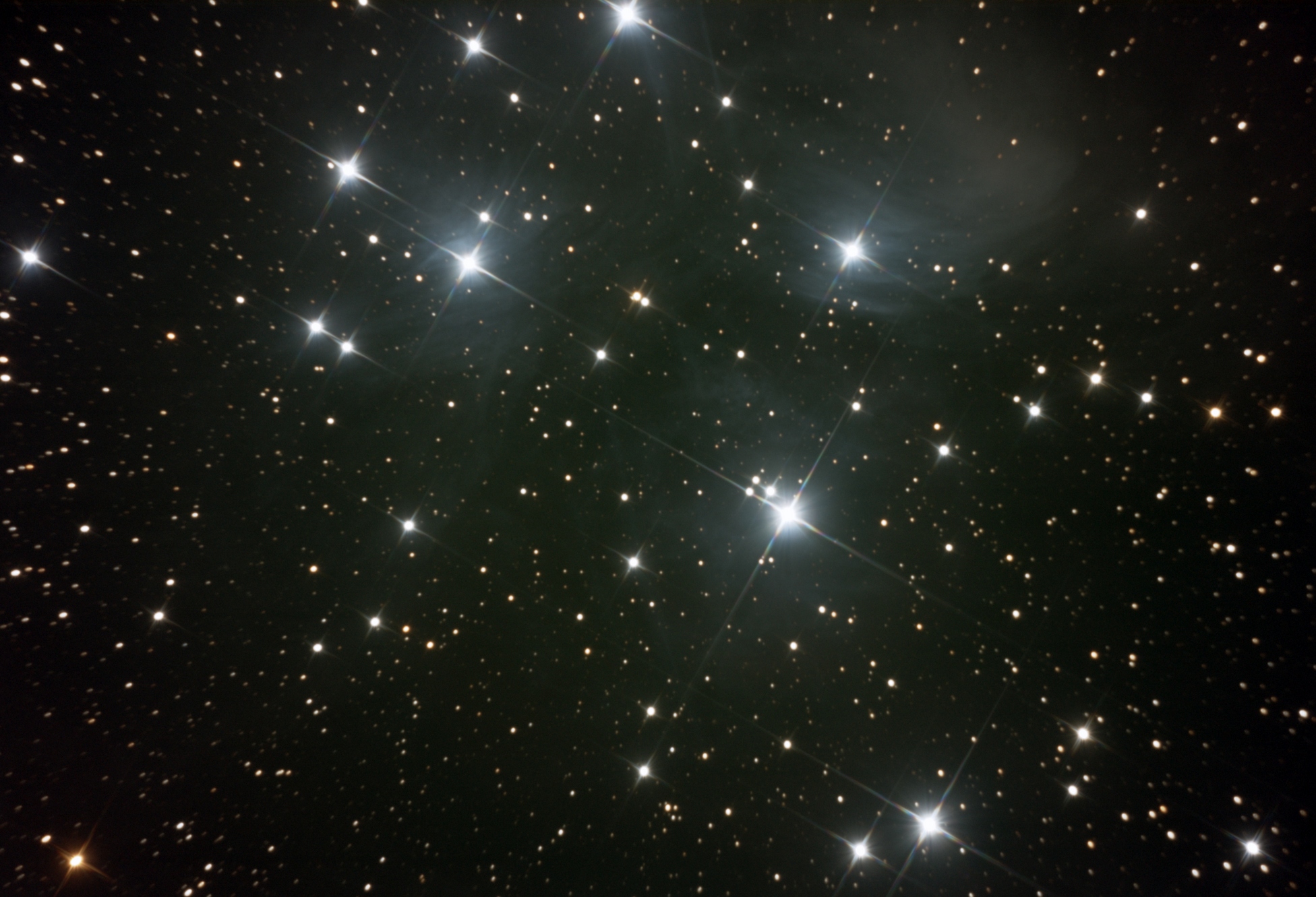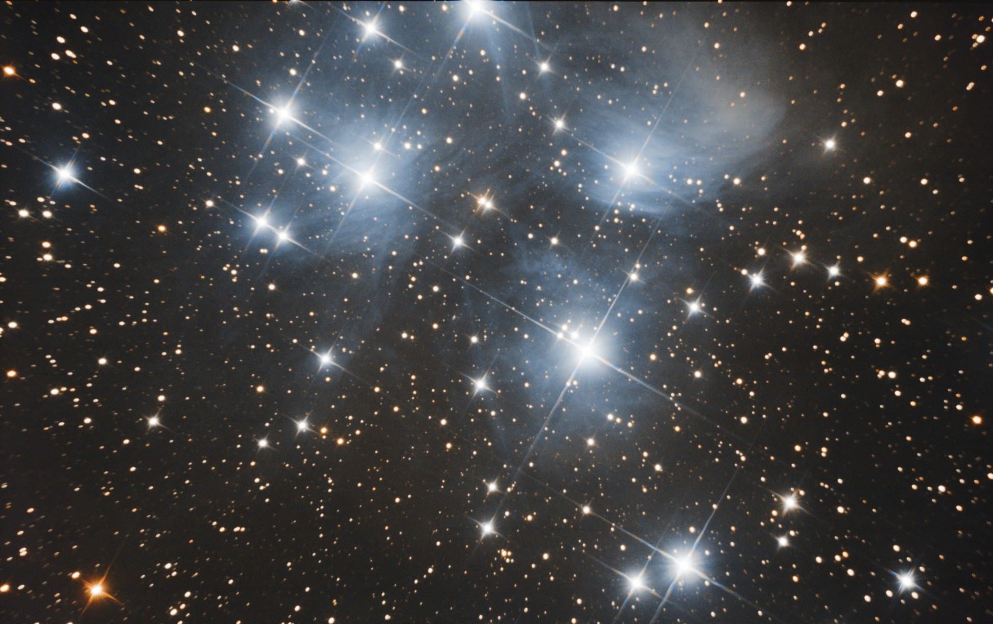 Подниму ка я пожалуй темку своими 5-копейками.... М45, оно же Плеяды-рассеяное звездное скопление в созвездии Тельца, расположенное на расстоянии около 440 св.лет от Земли. Снимал 21.09.15 в окне неба, которое не было затянуто дымкой. 150/750 ньютон+QHY8-L с охлаждением. Суммарная экспозиция немногим более трех часов. 37х300сек.+10х30сек. за кривое поле и цвета сильно прошу не ругать-я только учусь.