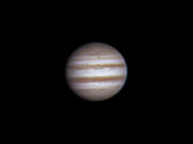 Юпитер, 27 марта 2014 г., 23:38. Sky-Watcher SK 90 Mak, Vixen Porta II (ручное ведение), линза Барлоу Sky-Watcher 2х с Т-адаптером, Canon 550D (640x480@60fps), PIPP, Autostakkert (3500 кадров из 6800, drizzling 1.5x), Registax 6, PS.
