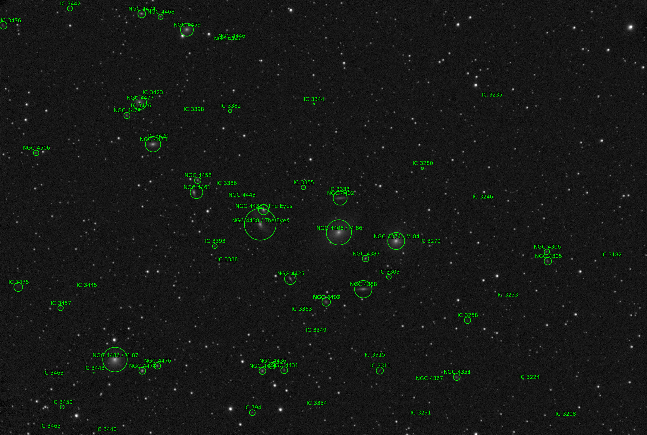 Кроме того - фото с обозначениями объектов. Как же там их много. Проработаны галактики слабее 14-й величины, расстояние до которых превышает 60 млн. световых лет.