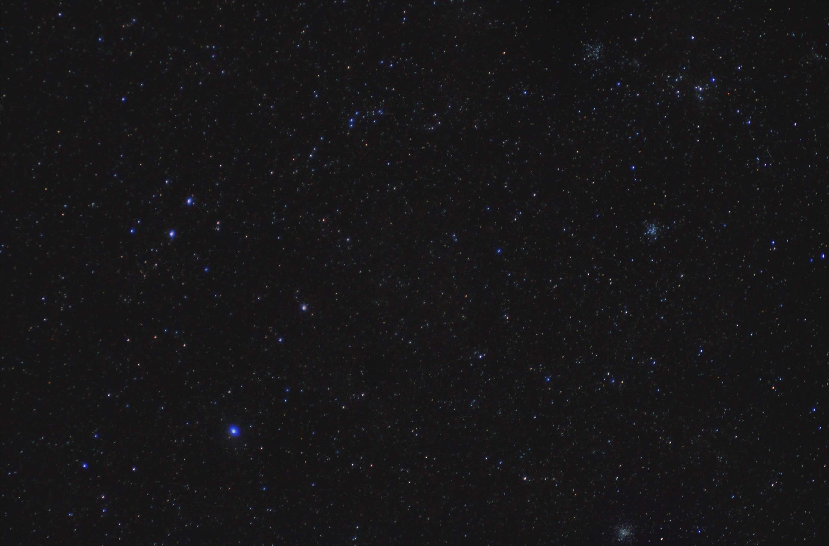 Сергей Цыба: Рассеянные звездные скопление М37 (NGC 2099) и М36 (NGC 1960) в созвездии Возничего. На одиночниках было 3 скопления, но после сложения прога увы верхнее обрезала так уменьшай фокусное и будет 3