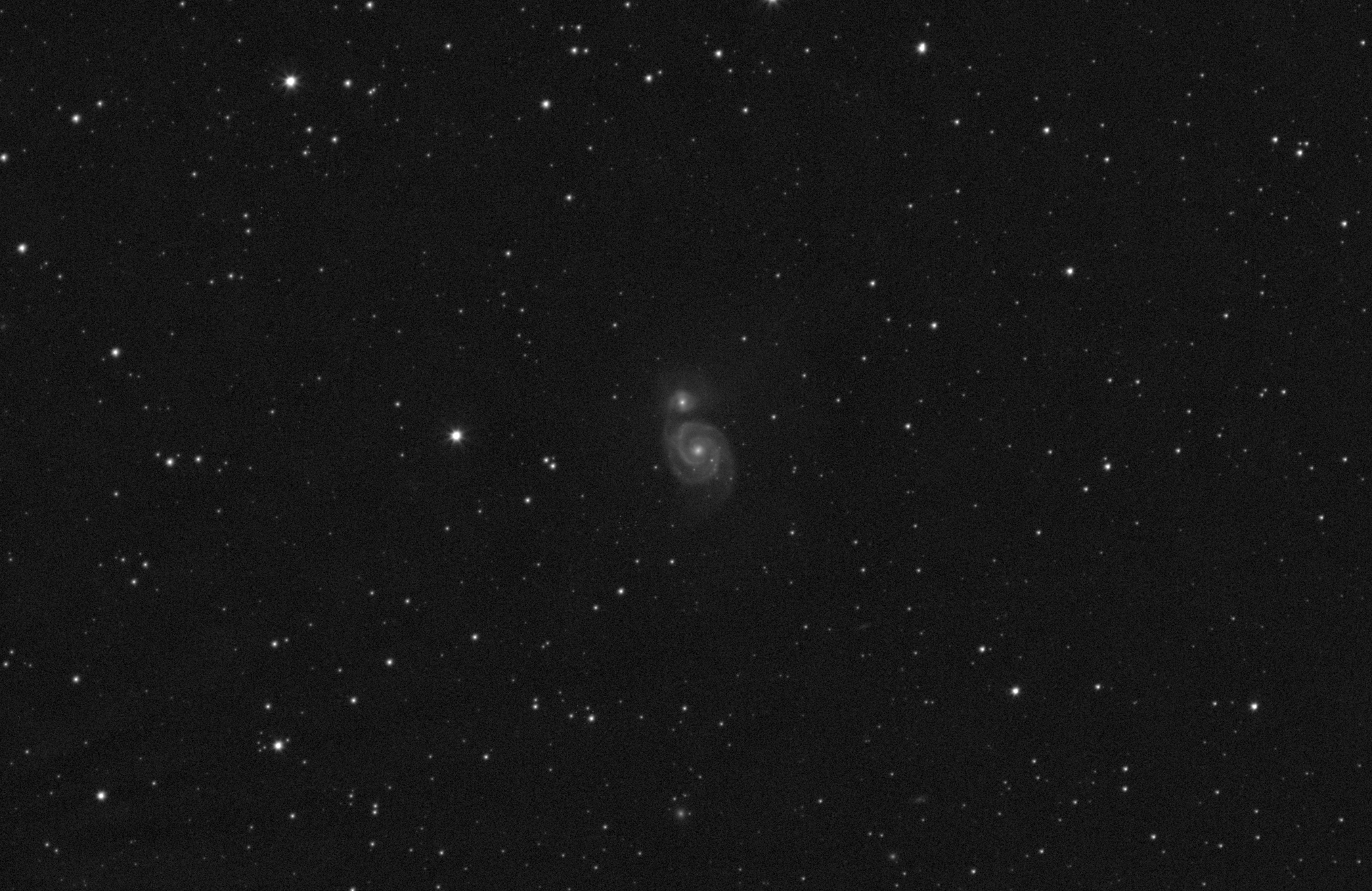 Результат съемки в течение двух ночей. 6.04.2020 года. (при полной Луне), и 9.04.2020 года. (Луна уже не полная, взошла позже, и располагалась значительно ниже над горизонтом, соответственно мешала меньше). Всего было снято 64 кадра по 180 сек. Общее время: 3 часа 12 мин. Итак, галактика М51 в созвездии Гончие Псы. Она же "Водоворот". Снято на фото объектив Юпитер 21М (фокус 200 мм., диафрагма прикрыта примерно до 5-ти.) + камера ZWO ASI178MM. Север вверху. Масштаб 70%. Пиксельный масштаб: 3.53 arcsec/pixel. Место съемки без изменений улично-балконно-оконная обсерватория.