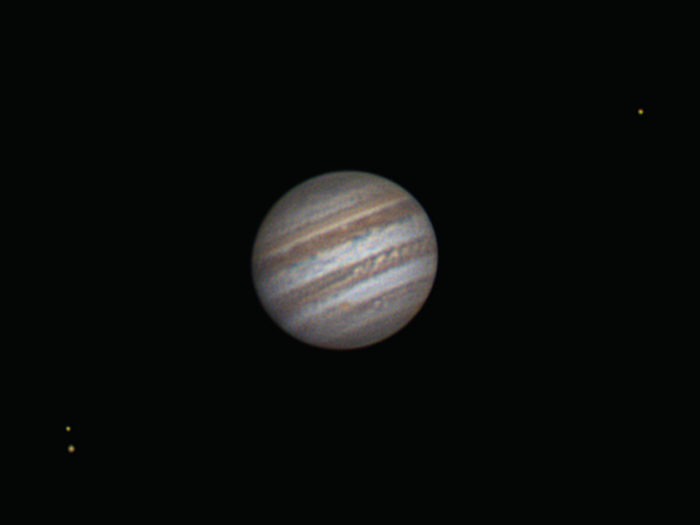 7 июня 2017 г, балкон, Ньютон 130/650 + ЛБ5х, Кэнон550, РАВ-видео, кроп 640х480, 30к/сек, ролик 32 мин. Масштаб 125%. Юпитер без особых явлений, зато в кадр попали 3 спутника - Европа и Ганимед слева, Ио справа. А еще заметно Малое Красное Пятно и большой иллюминатор.