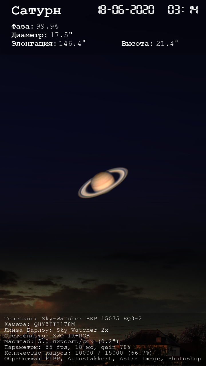 Дякую всім за відгуки! Для мене це теж особистий найкращий знімок на висоті менше 30 градусів. На рівнині висота планети це головне. Зазвичай, на висоті менше 20 градусів взагалі нічого путнього не виходить, цей знімок виключення. Памятаю це був вечір, коли прийшов гарячий антициклон, навіть фронт, перед антициклоном, в результаті повітря на ніч не охолоджувалось, його температура була сталою майже всю ніч, а на наступний день почалась 40 градусна спека. А з приводу кольорів і відтінків, я теж пробував різні... але вони все одно не будуть справжні, бо в канал яскравості домішано багато червоного