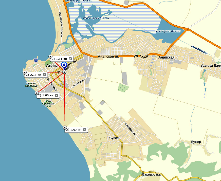 Море с южной, западной и северо-западной стороны Примерное расстояние показал на карте. К слову, уже в 1 км. к югу от города засветка в южной части неба заметно снижается, летом наблюдать окрестности Стрельца - сплошное удовольствие.