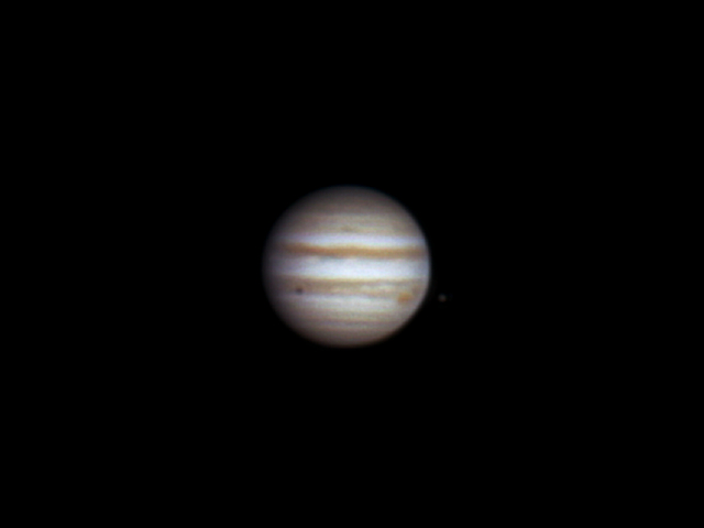 Юпитер, Европа и её тень. 31 марта 2014 г., 22:26. Sky-Watcher SK Mak 90/1250, Vixen Porta II (ручное ведение), линза Барлоу Sky-Watcher 2x с Т-адаптером, Canon 550D (640x480@60fps), PIPP, Autostakkert (3500 кадров из 10000, дриззлинг 1.5х), Registax 6, PS. Масштаб 75%.