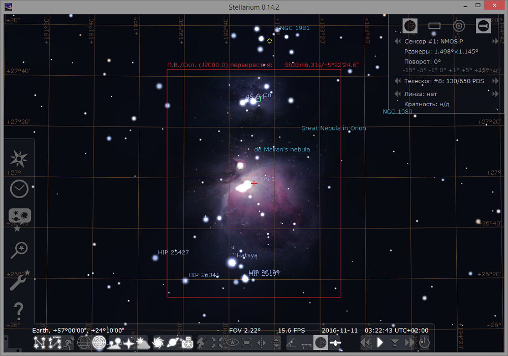 Вячеслав Шаронин писал(а): А также не знаете ли вы как соотнести для камеры Celestron NexImage 5 МP с аналогом увеличения окуляра в миллиметрах(т.е. чему соответствует) и если есть какая-то формула перевода параметров матрицы (камеры) ее физических размеров и величины зерна - чтобы на выходе получить аналог окуляра мм - ведь так проще будет ориентироваться при покупке другой камеры. У меня и Celestron NexImage 5 МP и Canon 550 есть и хотелось бы прикинуть если подключать 5D MarkIII (там матрица полноразмерная) что получиться на выходе. С Уважением Вячеслав Из практики могу сказать следующее: Соотнести матрицу с окуляром действительно удобно, если опустить, формулы и всё остальное то можно принять, что диоганаль матрицы mm приблизительно равна фокусному расстоянию окуляра mm. (При условии что окуляр обычный 50-60*) А если хотите узнать точное поле зрение и размер тела на конкретной матрице + телескоп ТО не стоит заморачиватся с формулами установите Stellarium и запустите плагин Окуляры В настройках укажите параметры конкретной матрицы, фокусное расстояние телескопа, объектива, окуляров и т.д. Далее программа сама вычислит какое поле зрение и увеличение у вас получится на конкретных инструментах  Вот пример как всё это выглядит: Матрица PL5 17x13mm + Телескоп SW 130/650mm