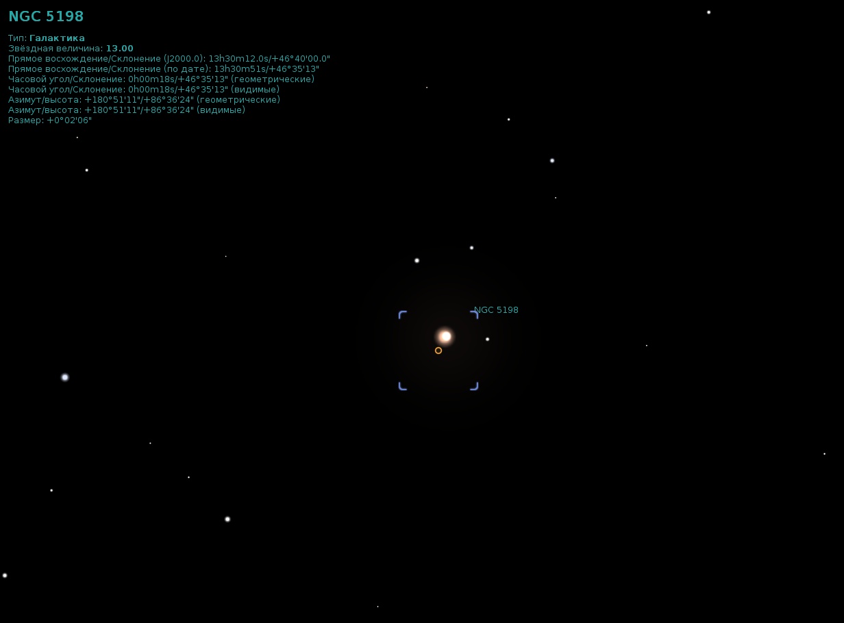 Валера Леванда писал(а): Снял объект под галлактикой Подсолнух,но он не на что не похож с программы стилариум,думал м94 но не похожа,что это может быть не пойму,подскажите- 375шт 8,5 секундных кадра,ШК10,редуктор 0,5 ,с балкона,автоведение,ДСС,ФШ. Валера, поздравляю, Вы сняли эллиптическую галактику NGC 5198, 13 звездной величины https://ru.wikipedia.org/wiki/NGC_5198Она правда значительно выше Подсолнуха, зато чуть ниже Водоворота Вот скрин из Стеллариума  Просмотров: 1354