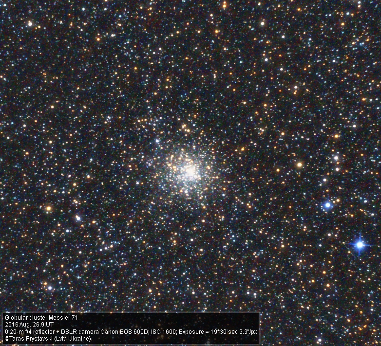 Кулясте зоряне скупчення Мессьє 71. Мені здається, фотографії з великою кількістю зірок виглядають цікаво, скупчення не губиться, а навпаки, доповнює картину своєю присутністю.