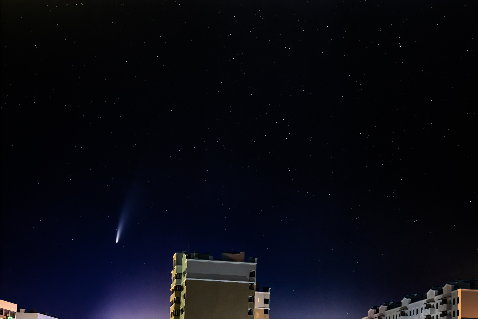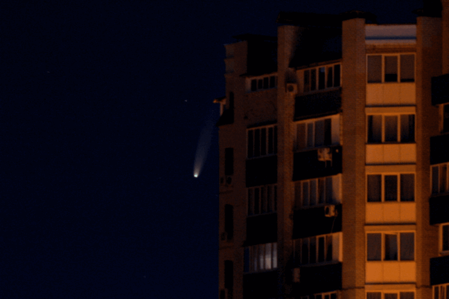 Комета С/2020 F3 NEOWISE 11.07.2020 г. (период сьемки 03:15-03:18 по Киеву) г. Киев Фотоаппарат: Nikon D5100 Обьектив: Nikkor 55-300 мм Неподвижный штатив Параметры: 55 мм | f 6,3 | ISO 500 | 8 сек. сложено из 21-го фото в программе Sequator, доработка в Photoshop.