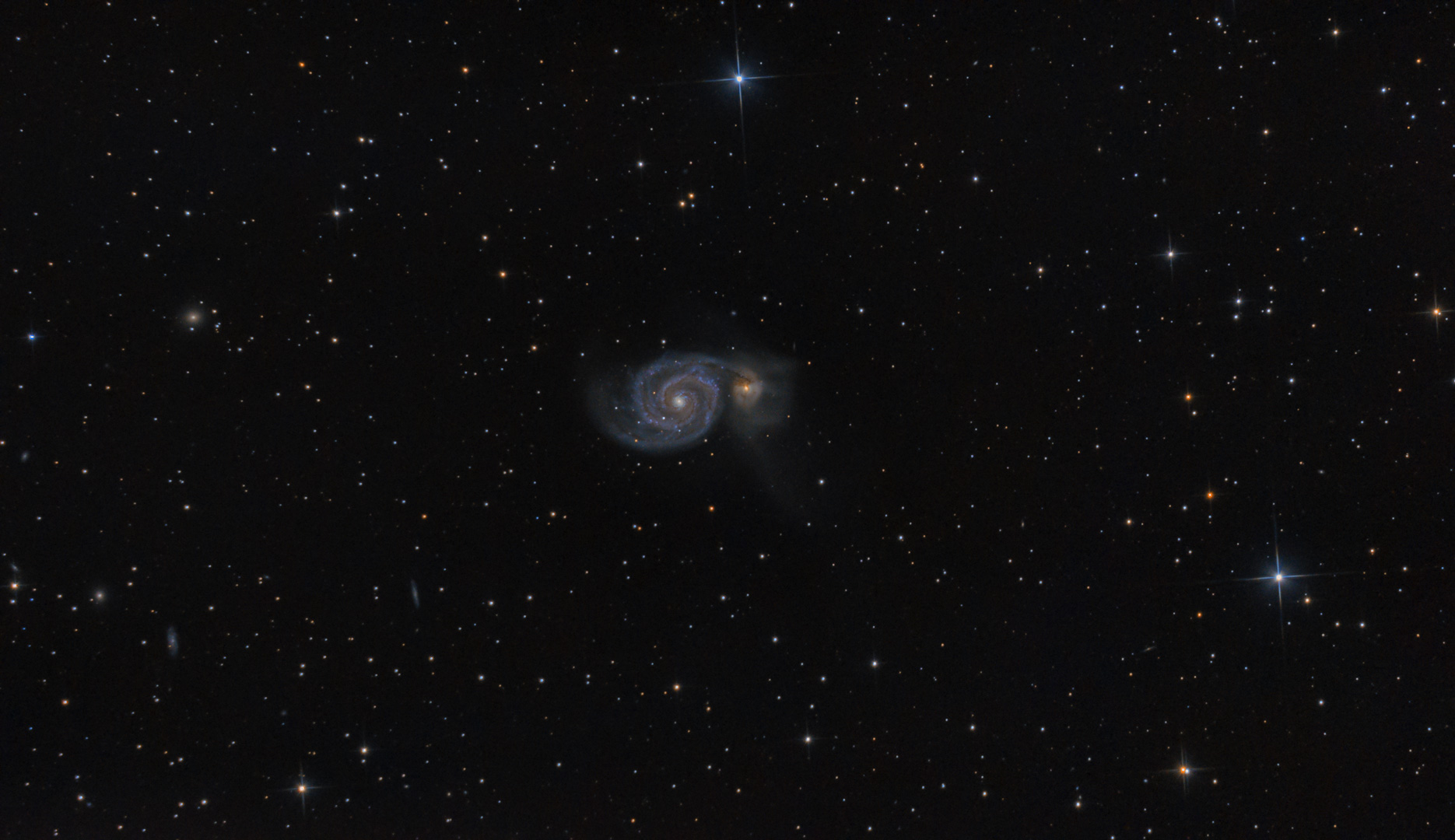 Мой вариант М51-"Водоворот" 25.04.2020 Съемка: Nikon D90+Arsenal 150/750, HEQ5 Pro, Корректор комы Baader Planetarium Mark III MPCC, ISO800 / 50*150c+dark+flat Обработка: DSS+FITStacker+Fitswork+PS Resize 50%