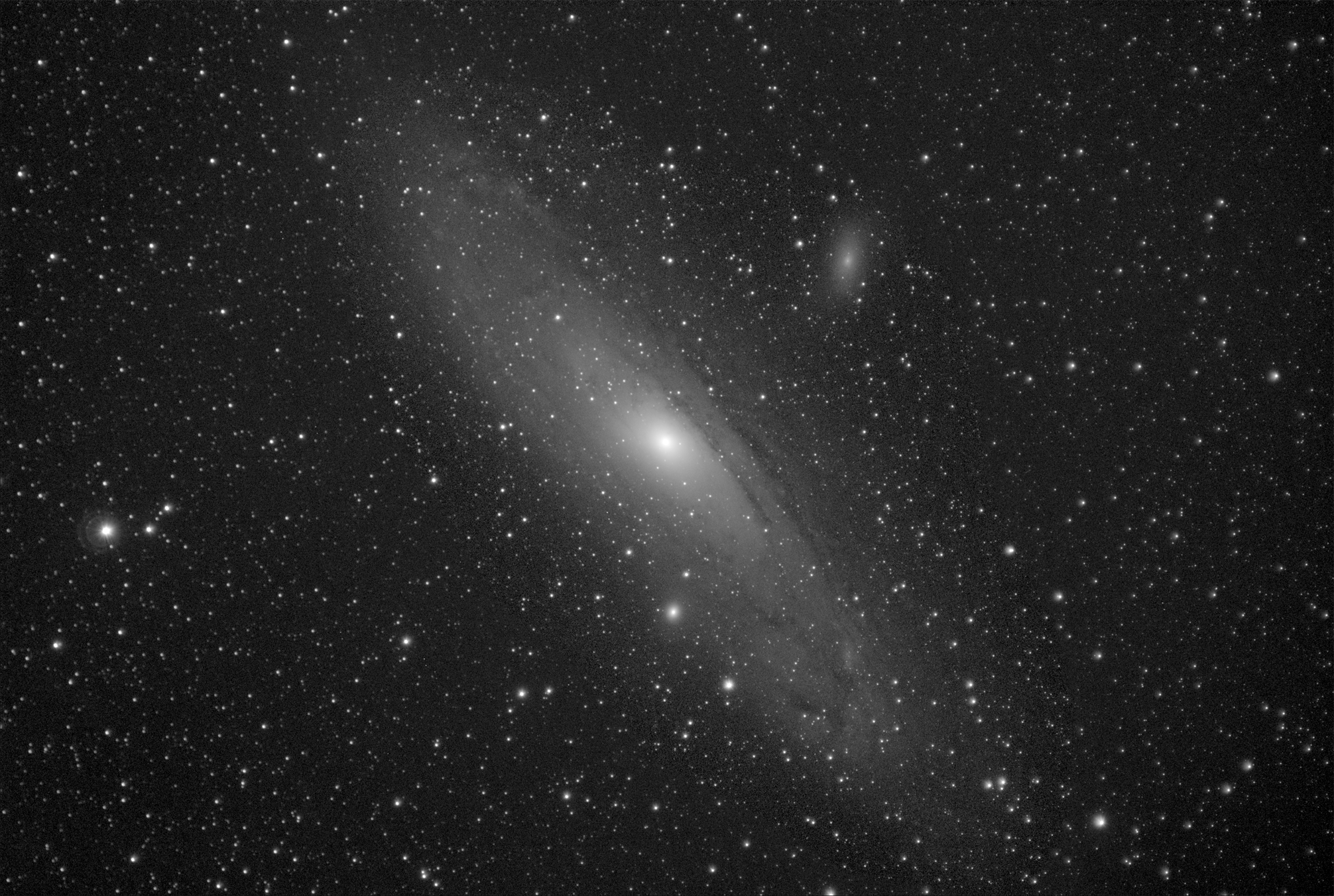 Сегодняшний подход к Туманности Андромеды М31 с ее соседями М110 и М32. Оборудование: Юпитер 37 - фокус 135мм, f/3.5, камера ZWO178MM, отсекающий фильтр Baader Planetarium Neodymium + зеленый фильтр. Моторизованная монтировка EQ3-2 с гидированием. Итого: 20 кадров по 150 сек. Масштаб 65%. Место съемки улично-балконно-оконная обсерватория.