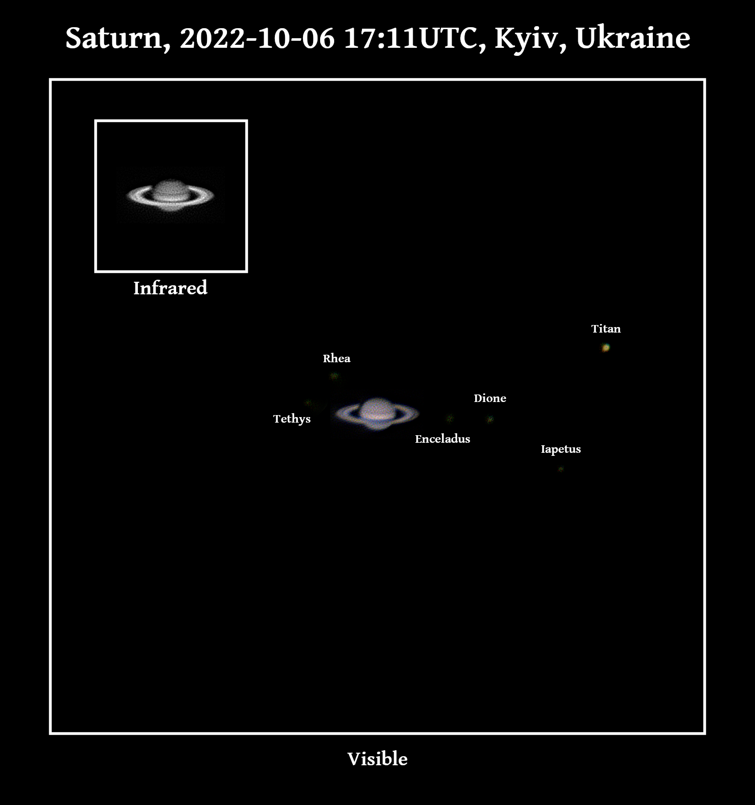 Сатурн 01.07.2023 р. (04:19 за київським часом) Сфотографовано в м. Київ Обладнання: Телескоп: Celestron MAK 127 мм Монтування: NexStar SLT Камера: ZWO ASI 462MC color Фільтр: Baader Neodymium 1.25" Параметри: Роздільна здатність: 640х480 Витримка: 20.1 мс Посилення сигналу (gain): 112 FPS: 49 Складено 2404 з 6049 кадрів Прямий фокус Зйомка відеоролика в SharpCap 4.0 Вирівнювання в PIPP Складання кадрів та вейвлети в Registax 6 Photoshop CC 2018