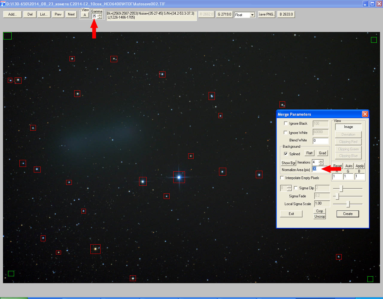 Обработка этого кадра в FITStaker будет отличаться от предыдущих двух — ведь нам надо «затереть» комету, а не подчеркнуть ее. Gamma оставляем на том же уровне, зеленные метки фона тоже аналогично, а вот красные метки поставим вокруг ярких звезд, а не вокруг трека кометы, слабый след которого все же остался. И самое важное — существенно уменьшим значение Normalize Area.  Просмотров: 4783
