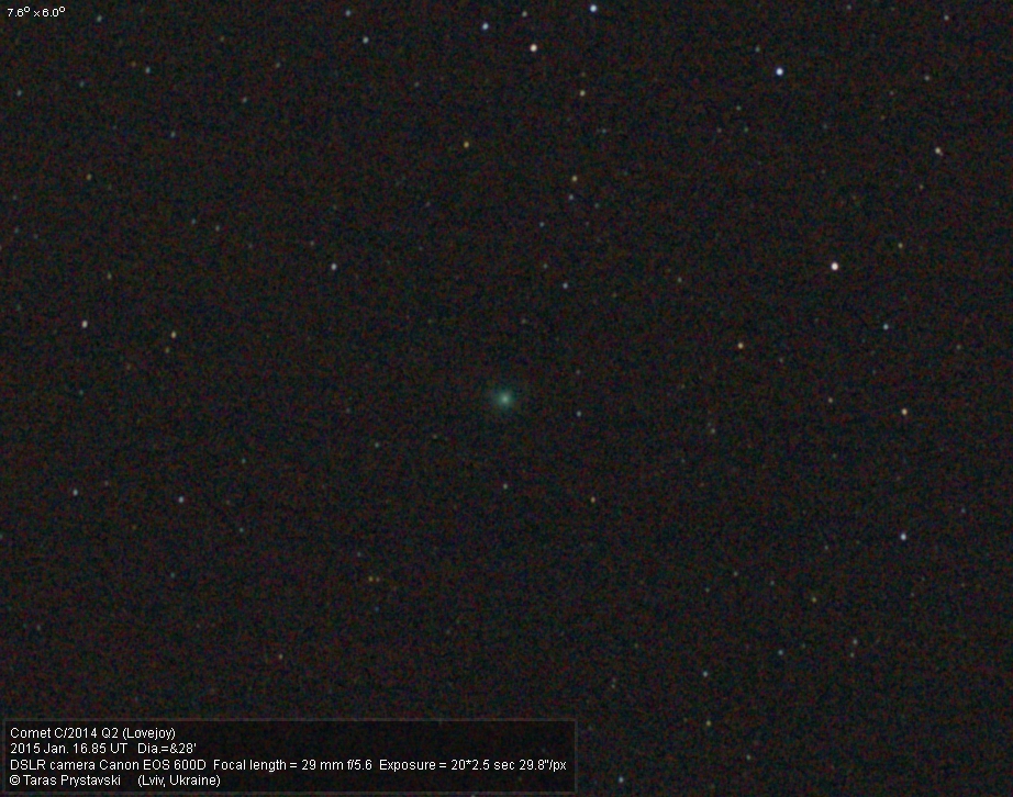 Масштаб фото 29.8"/рх, розмір кропу 7.6х6.0 град.Не дивлячись на короткі витримки і міську засвітку (клас 6 за шкалою Бортля), кома проявилася ймовірно вся (або майже вся): ~28' в діаметрі (практично діаметр повного Місяця!). Хвоста, на жаль, не видно.