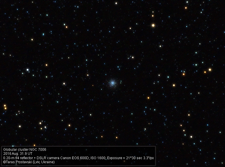 Маленьке, але дуже симпатичне скупчення NGC 7006 в сузір'ї Дельфіна. На одиночних кадрах воно було помітне, як невеличка туманна плямка, тож навіть не думав, що результат буде таким симпатичним. Думаю, NGC 7006 - це хороший об'єкт для власників апертурних телескопів Шмідта, де в пригоді стане хороша роздільна здатність і чіткість зображень.