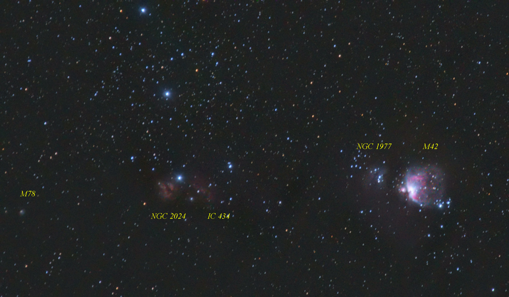 Участок неба в созвездии Орион. На фото представлены: - эмисионная туманность М42 (Большая Туманность Ориона) - туманность NGC 1977 (Бегущий человек) - эмисионная туманность NGC 2024 (Пламя) - туманность IC 434 (Конская Голова) - отражательная туманность М78 г. Киев. 09.01.2018 г. Фотоаппарат: Nikon D5100 Обьектив: Nikkor 18-105 мм Неподвижный штатив Параметры: Фокусное расстояние 90 мм F-5.6/ISO 800 215х6.0 сек. Калибровка, выравнивание и сложение в программе DSS, фон в Fitstacker, доработка в Photoshop, кроп.