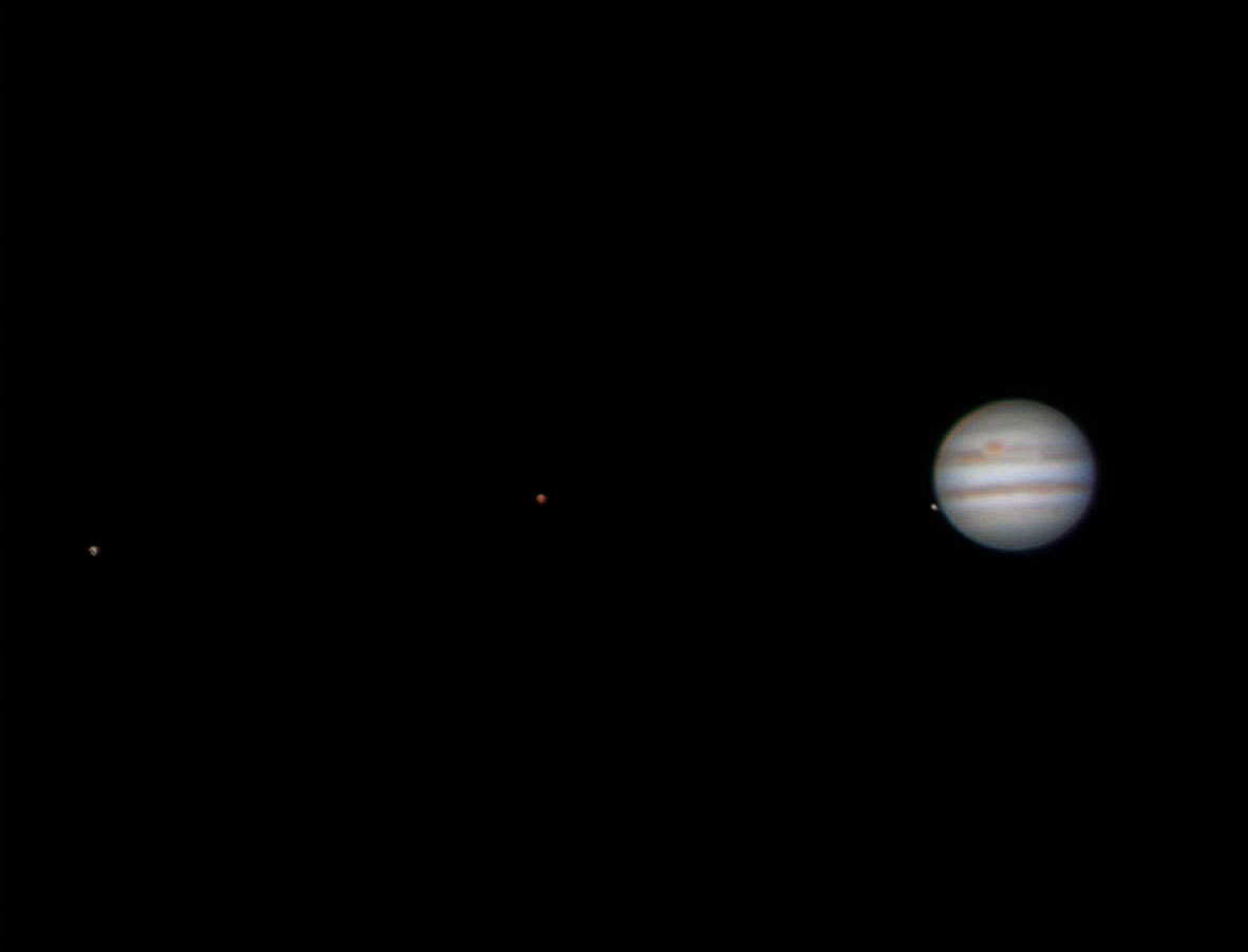 Юпитер красиво весит над домом.... Собрал, настроил телескоп и сразу же навёл на объект... Красотища! Четко виден диск с отчётливыми четырьмя поясами, отлично выделяющимся Большим красным пятном.