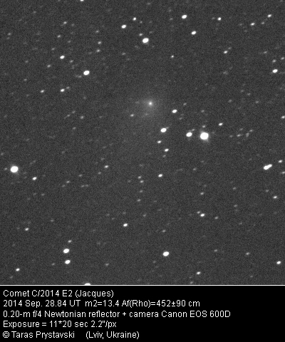 Комета Жакеса C/2014 E2 (Jacques) 28/09/2014. Експозиція 1 кадру 20 с / складено по кометі 11 кадрів/ ISO 800. Телескоп-рефлектор Sky-Watcher BKP200/F800, фотоапарат Canon 600D. Софт - MaxIm DL. Дуже заважає міська засвітка. Жахливий фон. Але якщо забираю фон, одразу пропадає частина коми. Тому тут треба вибирати...