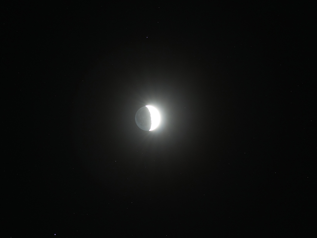 Еще одно фото сделанное простым телеобъективом 135 мм. Фотоаппарат был установлен на монтировке с ведением.Для получения пепельного света Луны и проработки звездного фона была сделана серия снимков с выдержками от 1/4 до 4 секунд, с последующим сложением в Регистаке.