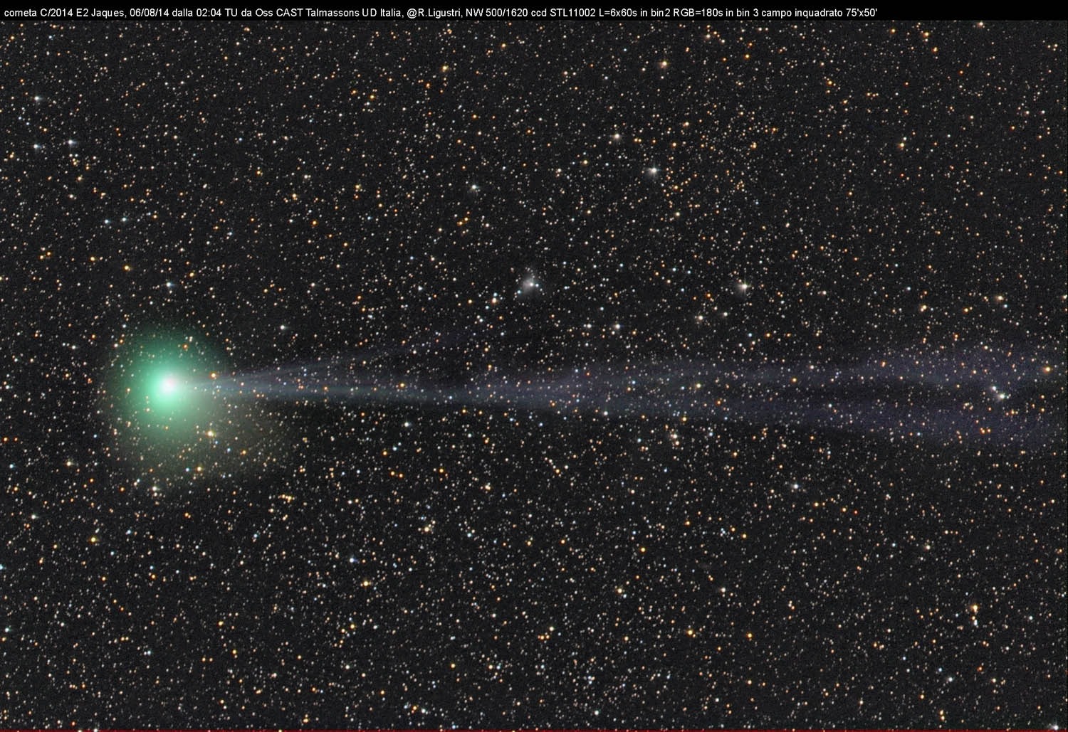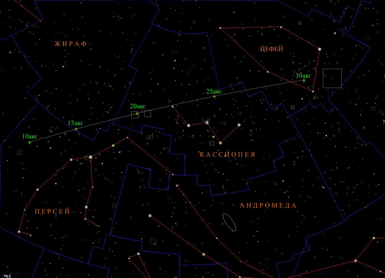 В августе 2014 года жителям средних широт Северного полушария представится хорошая возможность наблюдать достаточно яркую комету C/2014 E2 Jaques. Комета прошла перегелий в начале лета и уже удаляется от Солнца, но зато приближается к Земле и ее блеск постепенно увеличивается. Максимальной яркости (6,2 звездной величины) комета достигнет 22-23 августа и ее легко можно обнаружить в эти дни вблизи эпсилон Кассиопеи (левой верхней звезды этого W-образного созвездия) даже в небольшие бинокли. Комета будет доступна наблюдениям через 1,5-2 часа после захода Солнца в северо-восточной части неба и видна до рассвета, когда она поднимется практически в зенит. Из-за относительной близости к Земле, комета имеет довольно большое собственное движение и наблюдения даже в течении 30-40 мин покажут заметное смещение кометы среди звезд. Ниже приведена карта движения кометы с 10 по 30 августа 2014 года через созвездия Персея, Жирафа, Кассиопеи и Цефея. Надеюсь карта поможет Вам без труда найти комету на звездном небе. Удачи.