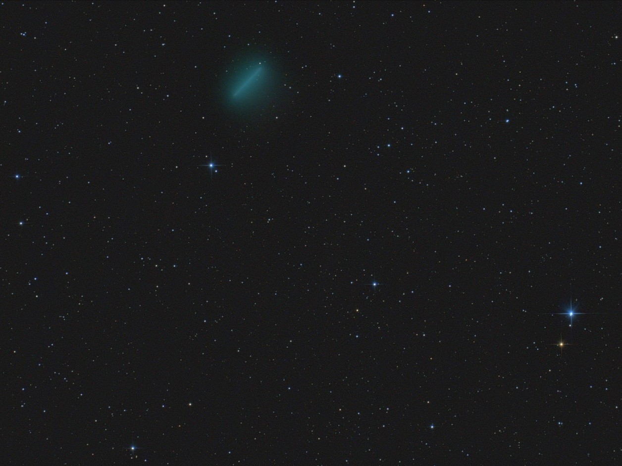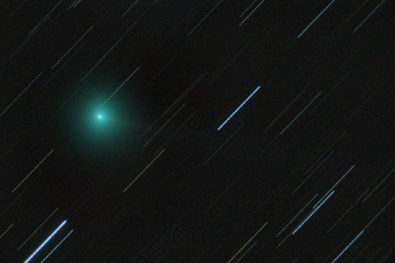 Снимаю сейчас, хотя высота кометы чуть больше 20 градусов, но даже на 10 сек выдержках (в красной зоне засветки) прекрасно виден зеленый цвет комы Да и в бино 6.5х32 я ее нашел в виде звездочки, без цвета конечно Так что рекомендую - комета достаточно яркая даже для скромных инструментов