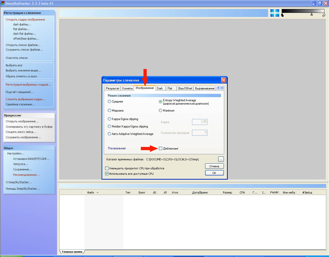 Вернемся к вкладке Dark. Обязательно включим опцию Поиск и удаление горячих пикселей, она поможет нам избавится от указанных выше цепочек. Опция Поиск и удаление битых колонок используется для некоторых специализированных CCD-матриц. Нам эта опция не нужна.  Просмотров: 9736